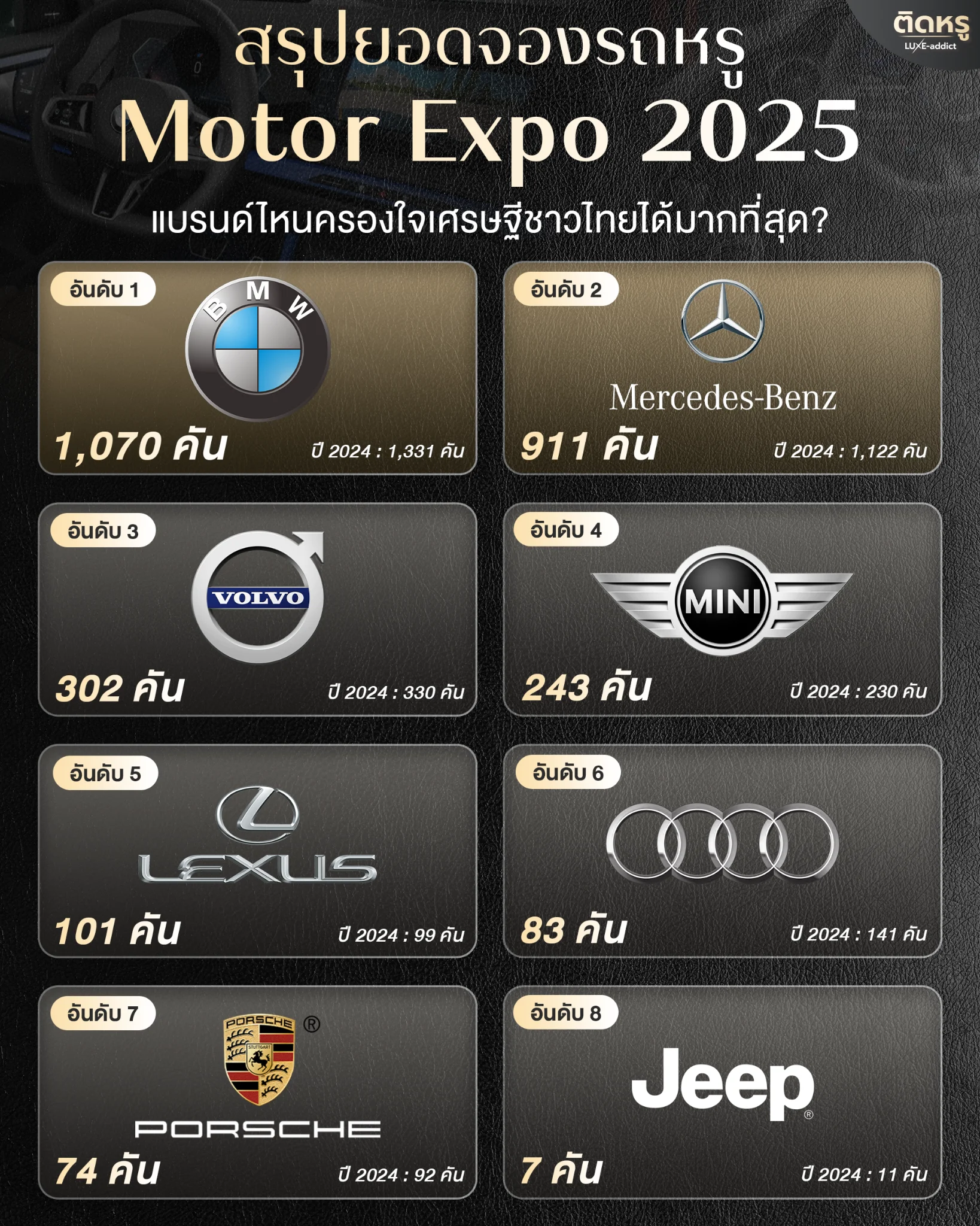 While the overall volume of bookings for most brands declined from 2024, the luxury market at Motor Expo 2025 remained vibrant. It clearly shows that "European Brands," especially BMW and Mercedes-Benz, remain the primary choice for Thai millionaires ready to spend for a superior level of excellence!